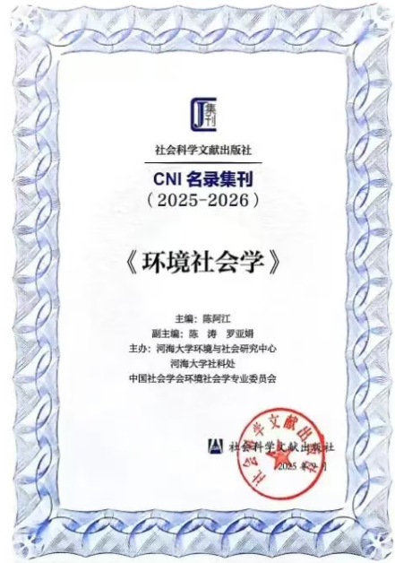 《环境社会学》是由河海大学环境与社会研究中心、河海大学社科处以及中国社会学会环境社会学专业委员会主办的学术集刊。《环境社会学》集刊创刊于2022年,每年出版2辑,至今已出版7辑。刊物坚持以特色立刊、以现实关切为导向、以构建中国自主知识体系为使命、以文章质量为生命线的办刊思路,在创刊第一年便从众多新创集刊中脱颖而出,获评社会科学文献出版社“2022年度优秀新创集刊”。2023年、2024年及2025年连续入选社会科学文献出版社“CNI名录集刊”。2024年被正式确立为中国社会学会环境社会学专业委员会会刊。