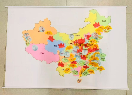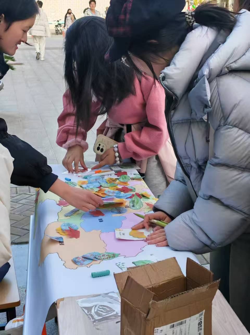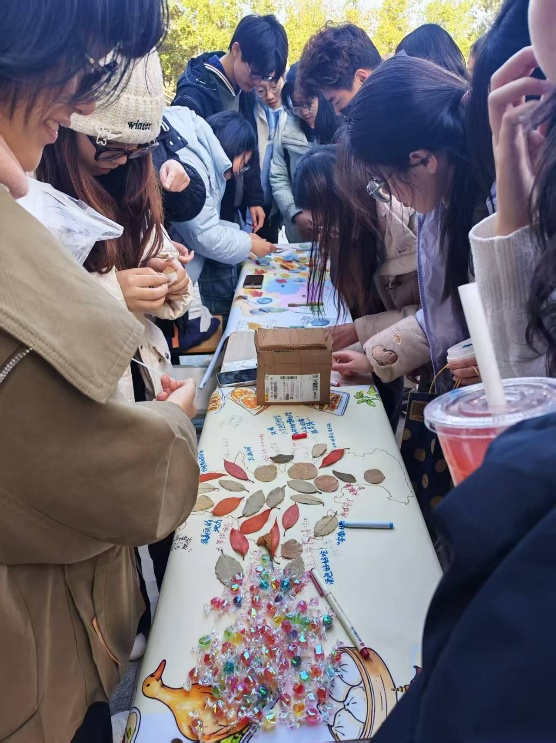 在“寄乡诉情”专区内,中国地图展板前人流不息。同学们领取筛选好的梧桐叶或银杏叶,以叶为笺,用彩笔书写对家乡的思念、描绘故土风貌,再将叶笺贴于地图对应省份位置,勾勒出“天涯共此乡”的集体乡愁。现场利用歌曲,让学子们在沉浸式氛围中倾诉思乡之情,疏解“异乡人”的情感焦虑。